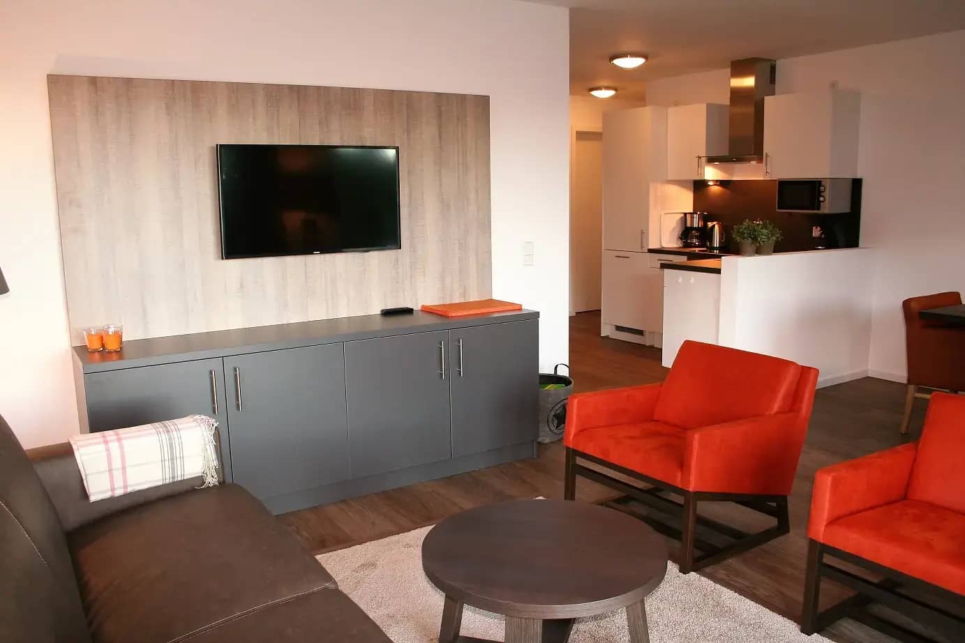 Die Ferienwohnungen der Residence Winterberg überzeugen mit einem modernen und gemütlichen Design, das keine Wünsche offenlässt. Auf euch wartet ein großzügiger Wohnbereich mit stilvollen Möbeln und einer gemütlichen Sitzecke, der zu entspannten Abenden einlädt. Die offene Küche ist hochwertig ausgestattet und der Essbereich bietet genug Platz für ein geselliges Zusammensein.